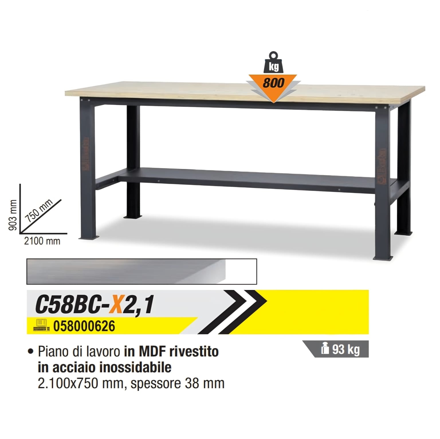 🚨Banco da lavoro semplice - BETA (art. C58BC-X2,1) - con una lunghezza complessiva di 2,1 m !! E una portata massima di 800 Kg!